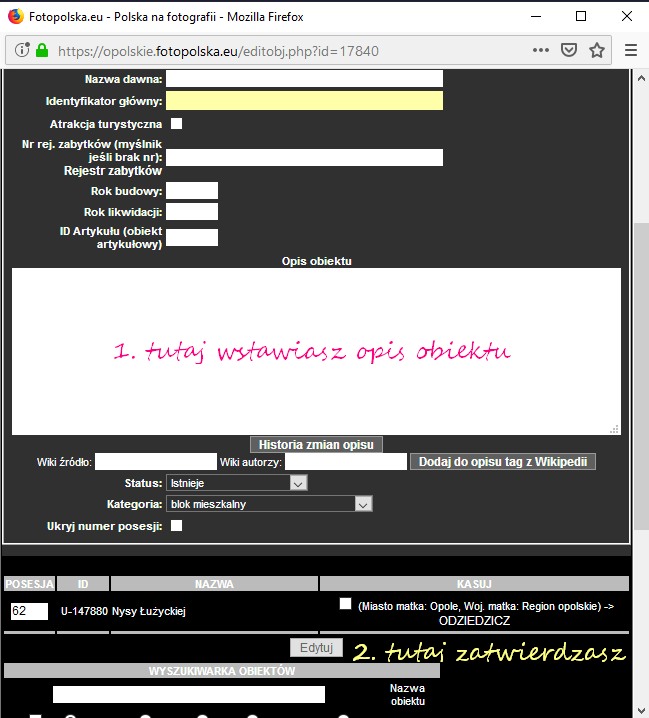 Gandalf*: Możesz edytować każdy obiekt który założyłeś. W tym celu wchodzisz na stronę obiektu, w menu u góry klikasz przycisk "edytuj". Pojawia się okno z formularzem edycji gdzie 1-wpisujesz tekst opisu, 2-zatwierdzasz przyciskiem "Edytuj". Zamykasz okno i gotowe, tutaj ściąga: .